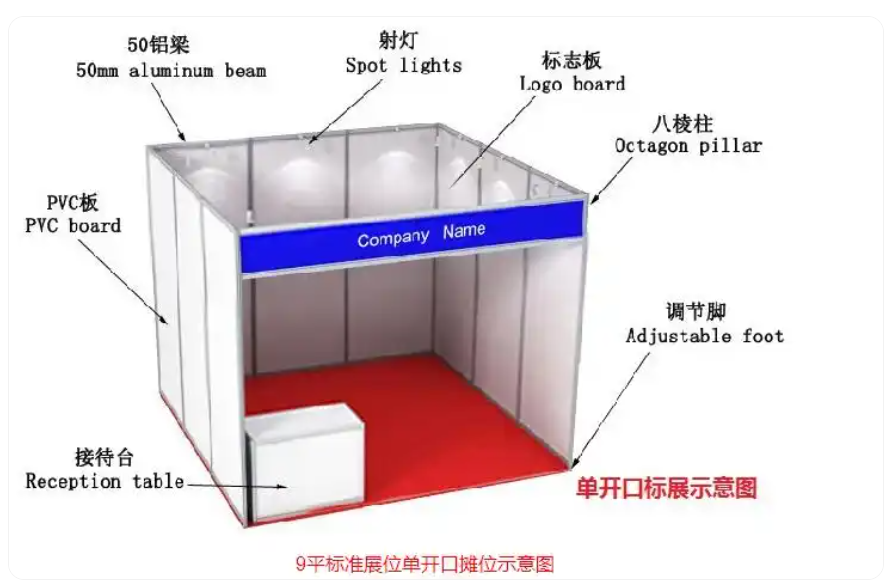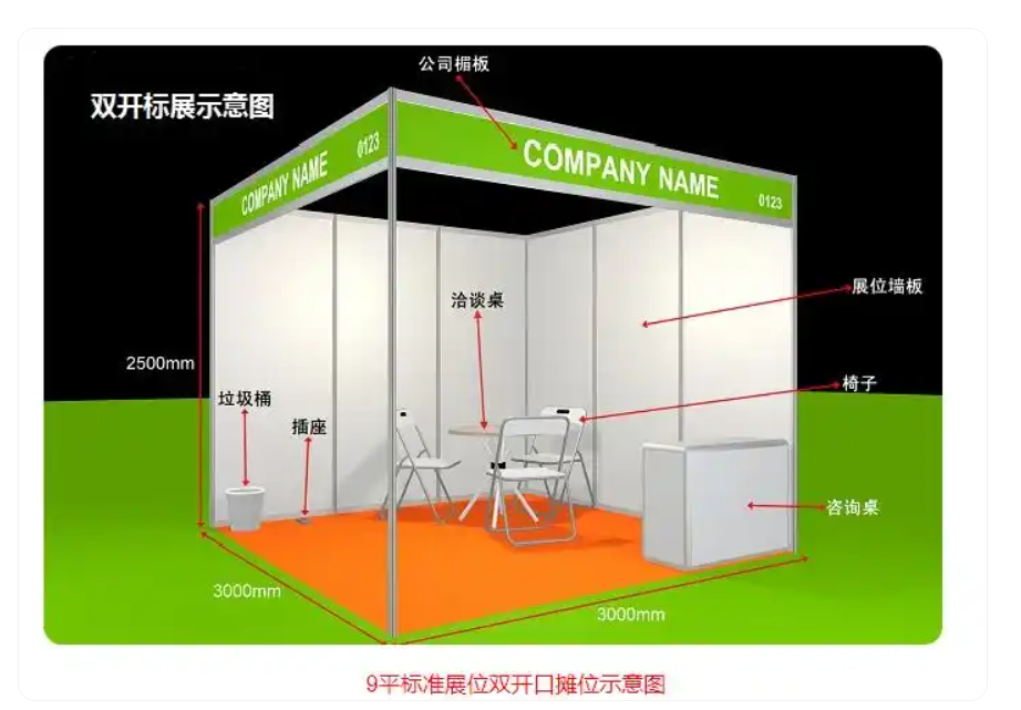 标准展位:指参展商预订的展位是由主办单位统一搭建好的,最常见的是9平米标准展,长宽高分别为3m*3m*2.5m。标准展位一般都会免费配置公司楣板、一张洽谈桌、两把折叠椅、两个射灯、一个220V插座、一块地毯。